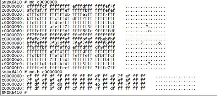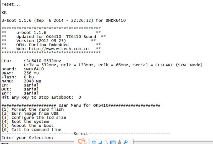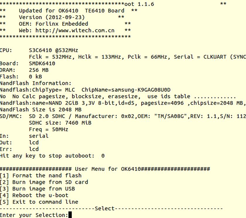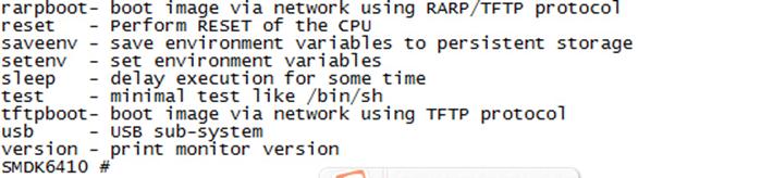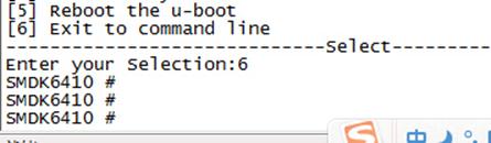 如上面的显示,我们的uboot可以工作了。Uboot通常会有上面的选择菜单。但是,我们现在是要看uboot下的命令。所以选择的是6,进入命令行: