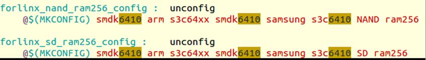 解压uboot的压缩包得到uboot的工程文件uboot,进入uboot,打开Makefile文件,搜索自己的开发板的类型。我的是OK6410 256的。