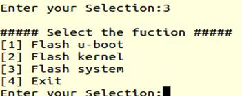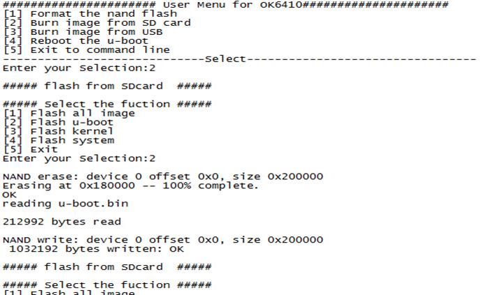 首先烧写我们的辅助安装程序mmc_256.bin到SD卡。设置开发板从SD卡启动。在启动的瞬间按住空格进入选择菜单。