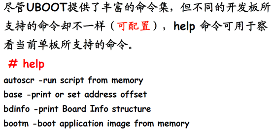 Uboot的命令是很丰富的,是在开发阶段实现的。现在我们是使用,所以没有涉及到如何增加命令的知识,我们只管用就好了。