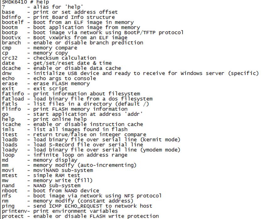 上面可以看到uboot支持的命令是很丰富的。前面是命令,后面是解释命令。