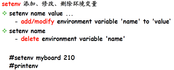 最后是删除环境变量:命令:setenv Myboard。后面不要跟参数,就会删除掉该环境变量。