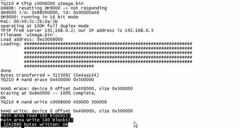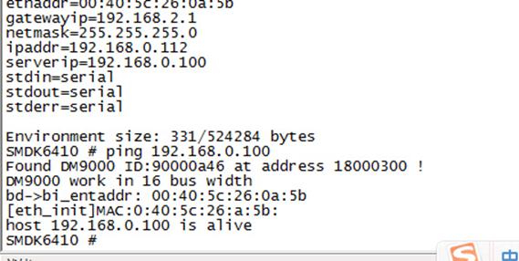 无论用ping命令还是tftp命令,都显示 CS8900 Ethernet chip not found?! 看了uboot1.1.6/include/configs/smdk6410.h,里面确实是配置为网卡使用CS8900,什么时候发布个配置为DM9000的uboot源码啊?或者发个补丁也行 此问题已解决 方法很简单,给用飞凌S3C6410的朋友一个参考。 a.用\u-boot-1.1.6-TQ6410\drivers\目录下的dm9000x.c和dm9000x.h替换OK6410的u-boot里的同名文件 b.用\u-boot-1.1.6-TQ6410\include\configs\tq6410.h里配置网卡的几行