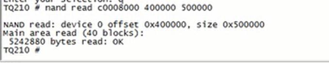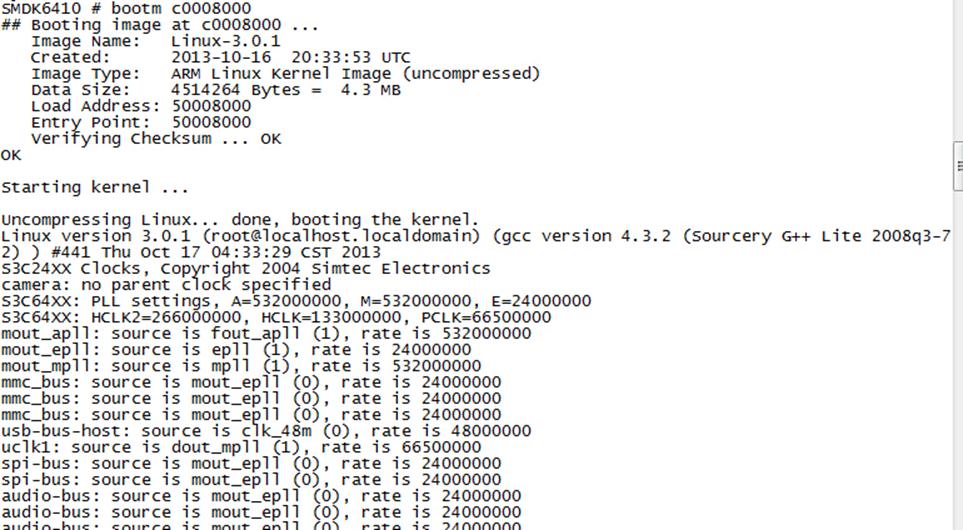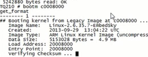 因为前面是烧写一个内核,现在已经读到内存当中。现在检验能不能启动它。Bootm c0008000