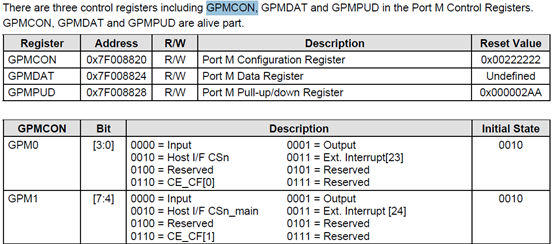 下面是6410GPIO的信息:GPMCON控制寄存器,GPMDAT数据寄存器。