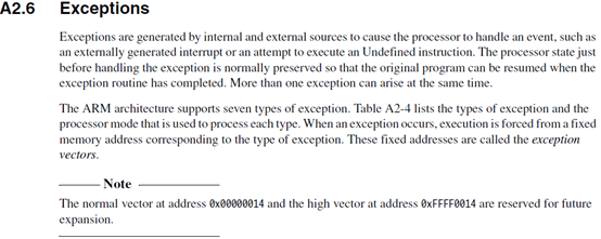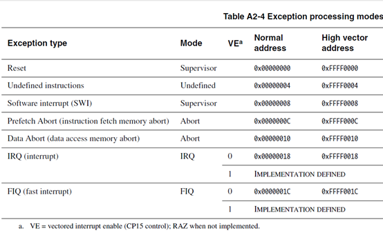 从上面的异常向量地址可以注意到,地址0x00000014没有使用。上图的右边可以看到有两组异常向量表可以使用。一组是低地址的,一组是高地址的。可以通过CP15对应的位来配置,当没有配置CP15的时候,默认是从低地址作为异常向量表。