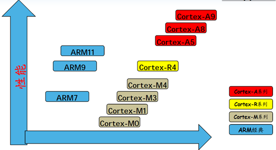 从上面ARM核的演变的过程中,ARM系列到了ARM11之后就结束了。而Cortex系列的一直在升级。从Cortex-M0到现在的Cortex-A9。可以注意到Cortex系列也分了三种:M、R和A系列。
