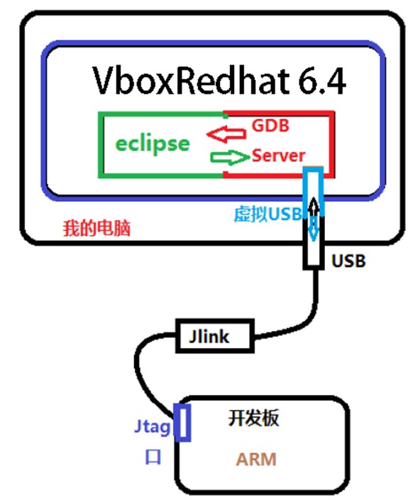 Eclipse集成开发环境不仅可以编译裸机工程,还可以调试整个裸机工程,这样当程序异常的时候,可以更加有效的进行修改。接下来就是搭建整个eclipse集成环境:这个调试环境的框架如下图1-1: