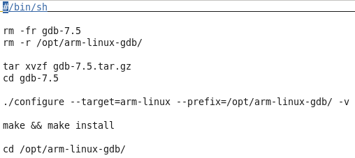 该脚本的功能是首先强制删掉当前目录gdb-7.5,删掉/opt/arm-linux-gdb/文件夹。确保环境里没有干扰因素。然后解压当前目录里的gdb-7.5.tar.gz。然后进入解压生成的文件夹gdb-7.5。接着进行gdb配置,执行./configure --target=arm-linux --prefix=/opt/arm-linux-gdb/ -v产生Makefile。接着就是执行make进行编译,最后执行make install进行安装。安装好了之后切换到arm-linux-gdb的目录。