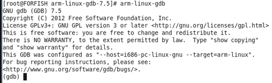 测试一下安装是否成功:在命令行执行:arm-linux-gdb,看到刚才安装的gdb是7.5版本的。图1-8: