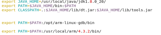 上面完成了arm-linux-gdb的安装,还需要对该工具进行环境变量的配置,才方便使用。打开/etc/profile配置文件:vim /etc/profile。在最后arm-linux-gcc环境的配置的前面加上: