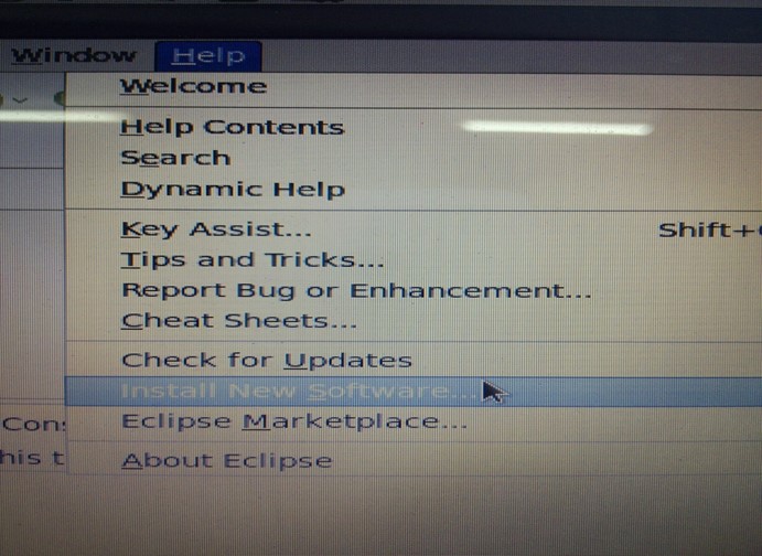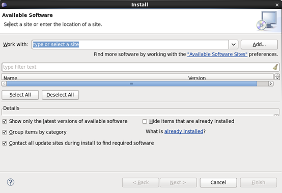 打开eclipse后,选择工具栏的Help,在下拉菜单选择Install New Software:会出现Install窗口。图2-8: