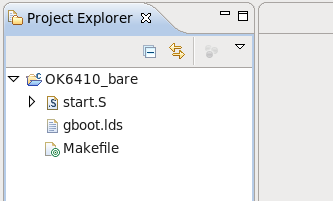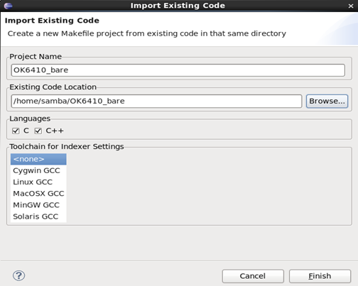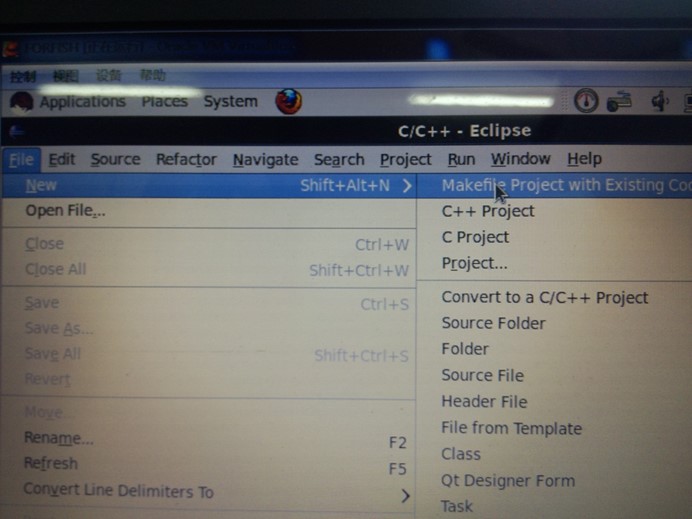 测试eclipse裸机调试的代码在:/home/samba/OK6410_bare,所以直接导入eclipse即可。选择eclipse的工具栏File->New->Makefile Project with Existing Code.图3-1:
