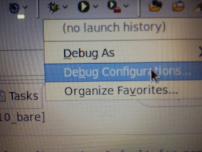 首先是点击eclipse的工具栏下面有一个像虫子的图标:点击它的下拉箭头之后会看见选项,选择Debug Configurations。图3-6: