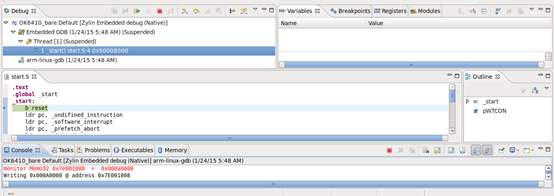可以看见界面下面红黑交替的就是在Conmands配置的,初始化板子的硬件平台的。接下来就可以真正地进行裸机单步调试了。