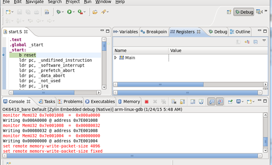 双击配置工程的名字:OK6410_bare Defunct:如果裸机调试启动成功的话,eclipse会自动跳转到Debug模式:图4-3: