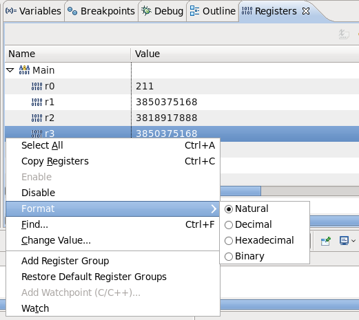 转化为16进制的:选中要转换的参数,右键,选择Format->Hexadecimal.图5-5: