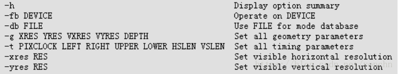 fbset [-ahinsvVx][-db <信息文件>][-fb <外围设备代号>][--test][显示模式]