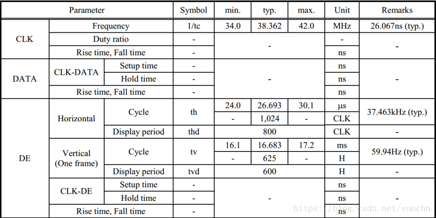 仍以 NL084SV01L 液晶屏为例,根据该LCD的数据手册,可知其部分参数: