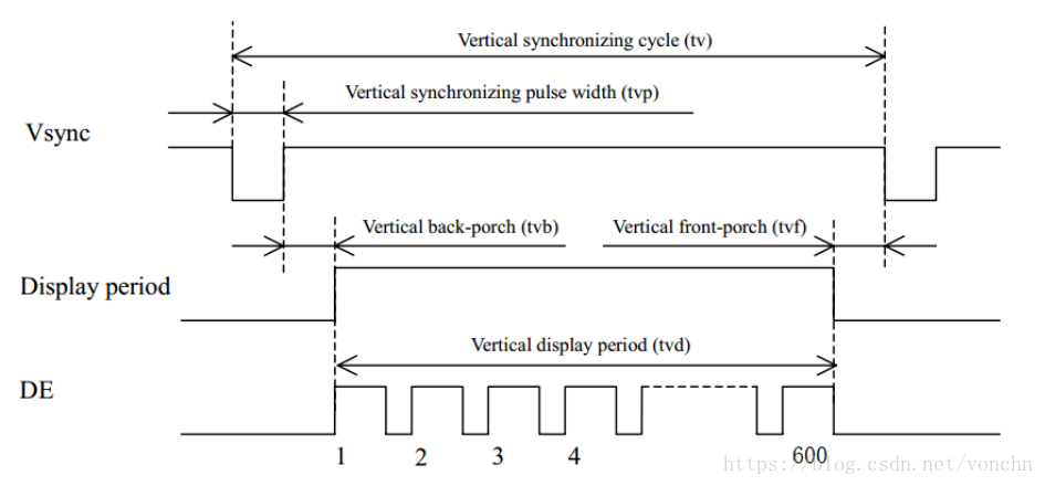 YRES值600为“Vertial Display period”,即图2中的 tvd;