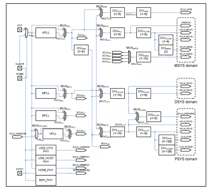 1) MSYS:用来给 cortex a8 处理器、DRAM 控制器、3D、IRAM、IROM、INTC(中断控制器)等提供时钟;
