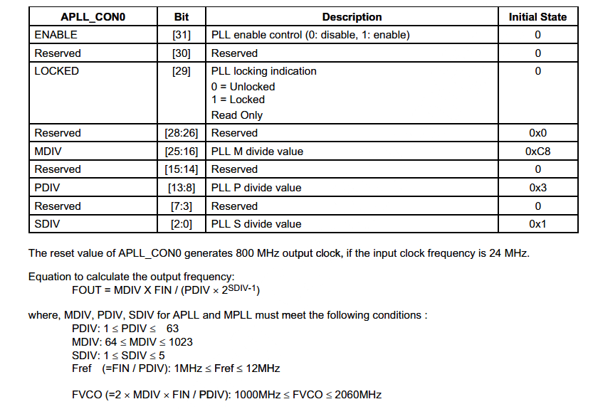 PLL 即倍频器,用来放大运行频率。 设置好分频后,我们就需要设置 PLL 了。 APLL 和 MPLL 的启动是通过分别设置 APLL_CON0 和 MPLL_CON 寄存器,我们逐个来设置。