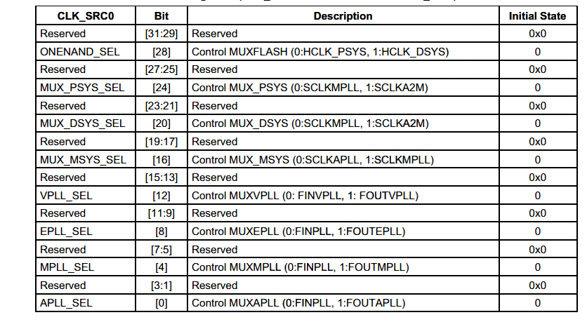 ARMCLK = 1000MHz = MOUT_MSYS / (APLL_RATIO + 1),经过在第四和第五步的设置后, MOUT_MSYS会被设置为 1000MHz,所以 APLL_RATIO=0 即可
