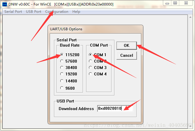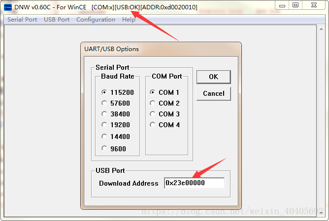 5、第一个文件烧录进去后,继续点击Configuration修改Download Address为0x23e00000,没有松开开发板按键,就一直会出现USB:OK(除了烧录的那一下)