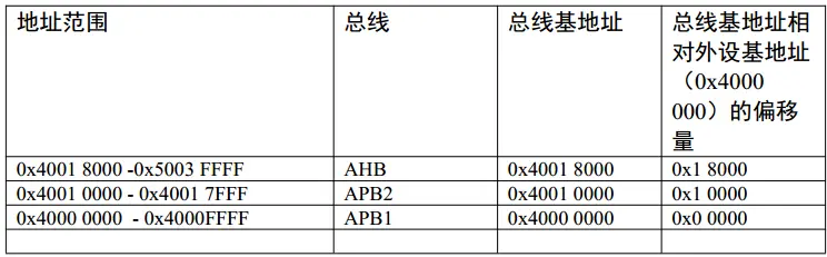 而 APB2 总线基地址相对于外设基地址的偏移量为 0x10000 个地址,即为 APB2 相对外设基地址的偏移地址,见表1。