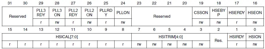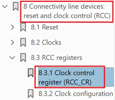 看到了RCC_CR,首先就是翻手册,RCC的章节的RCC_CR章节: