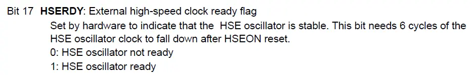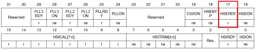 即第等待第18位(编号17)HSERDY的值变成1,当且仅当配置HSEON生效之后,该位置才会由硬件设置为1,注意在寄存器定义里面HSERDY配置为“r”,这个代表软件层面是无法改变这个bit的值,只能够读取: