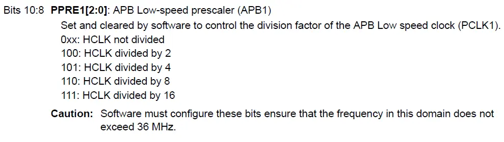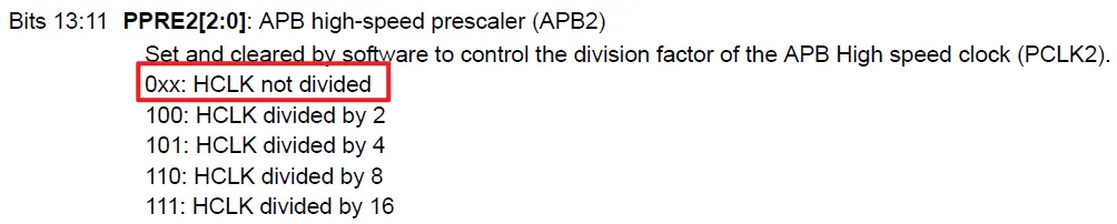 查看具体的某一位的定义,比如我们这里设置为0X00000400,4是在后四位,所以重点关注低16bit,即从15 ~ 0bit:0000 0100 0000 0000,发现正好配置的PPRE1,值为100,手册介绍如下: