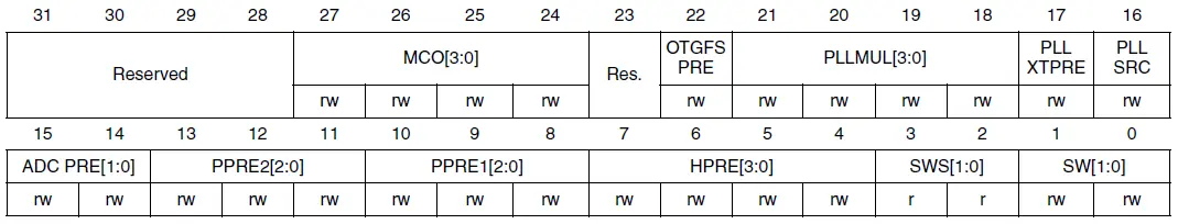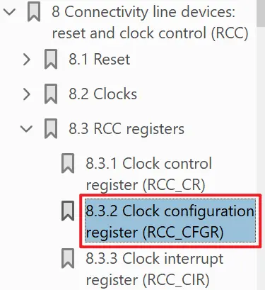 查看手册相应章节,并了解缩写意义,比如CFGR,全称Clock Configuration Register,时钟配置寄存器:
