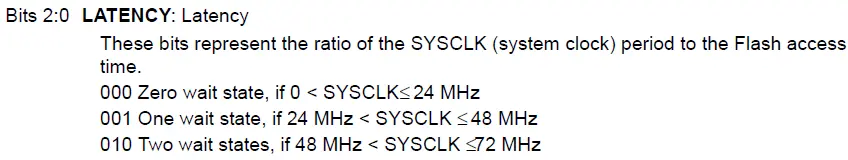 为什么需要做此配置呢?首先程序都是存放在FLASH里面,CPU需要从FLASH里面取出执行指令,所以通信之前需要首先同步时钟;那么就需要知道Flash的时钟和系统时钟(CPU时钟)之间的差别;又因为我们配置时钟是72MHz,这里010的时钟范围包含了72MHz;