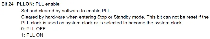还是套路:拆解0x0100 0000,只有高16位有有效值,低16位全零;高16位转换为2进制之后值为:0000 0001 0000 0000,所以我们看到对应操作的是PLLON位,PLLON位说明如下: