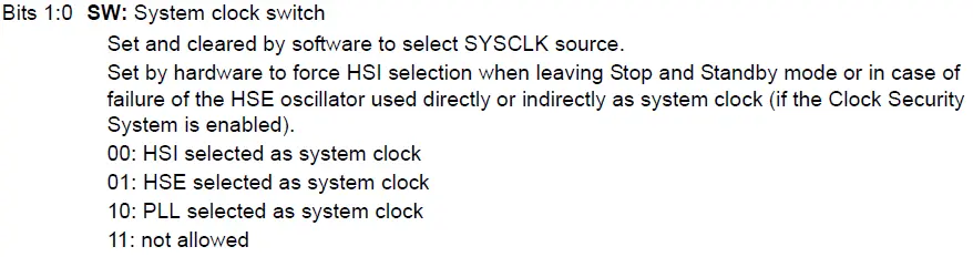 temp &= 0x03;}有效为发生在低16位,0000 0000 0000 0010,有效配置位是最后两位,即SW位(Switch,切换系统时钟之意),解释如下,可以看到10代表使用PLL的输出(PLLCLK)作为系统时钟: