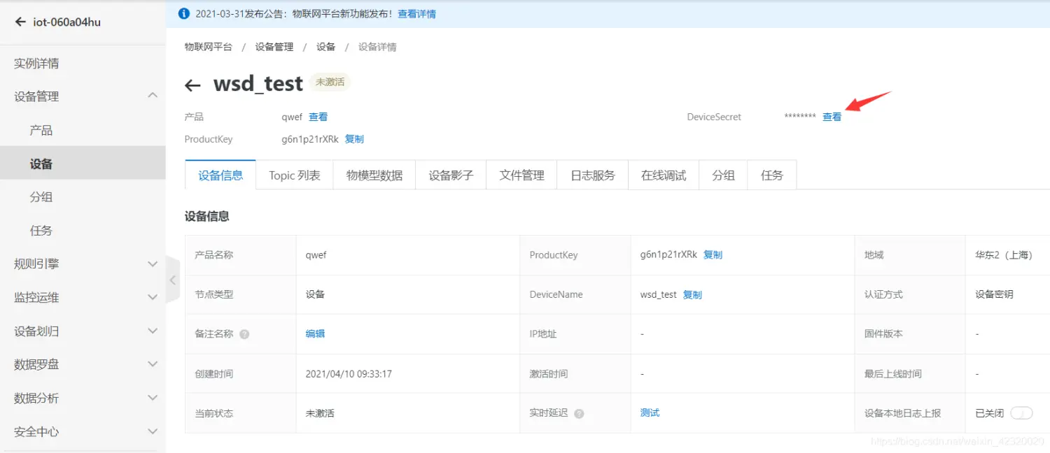 到阿里云物联网平台查看数据。点击设备点击查看,点击物联网数据,可以打开实时更新。