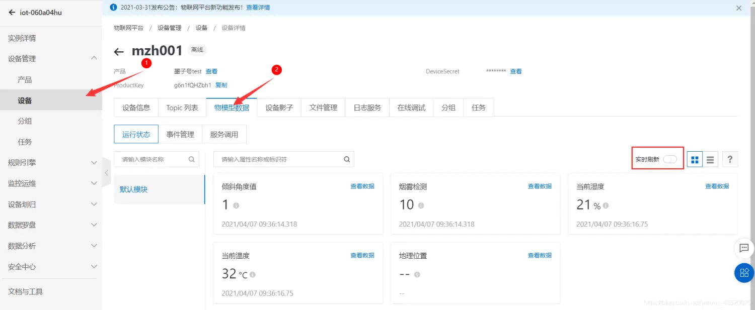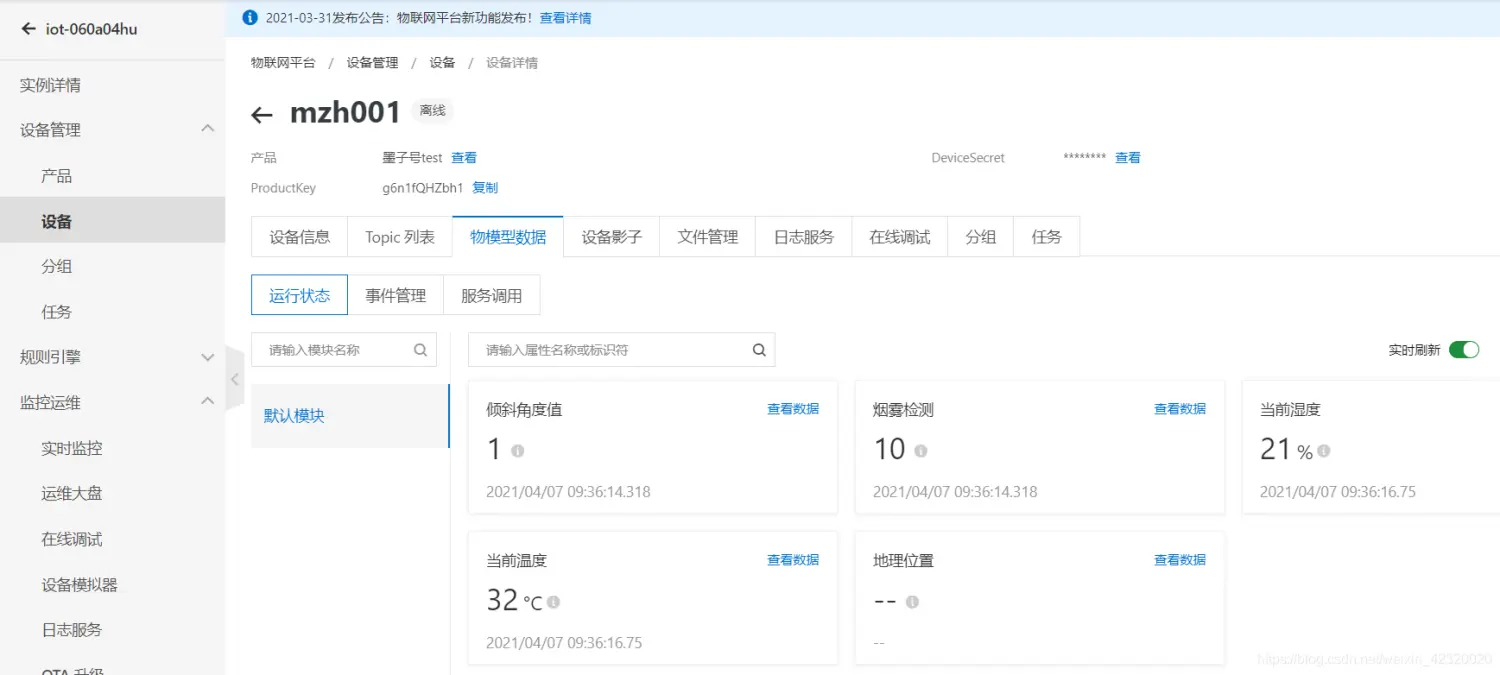 OK这个表示成功。到阿里云物联网平台查看设备。打开设备实时更新,可以看到数据更新正常。