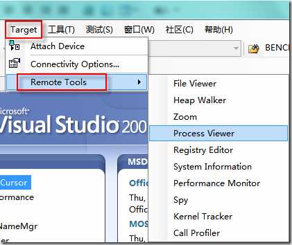 以上两套远程工具如果配置好了应该都可以正常使用。而'Target”菜单下的远程工具,需要做一个额外的操作,具体步骤请参考MSDN,http://msdn.microsoft.com/en-us/library/ee480836.aspx,否则,会弹出'Unable to load device side components”的提示。