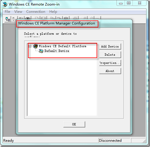 可以看到对话框名称为'Windows CE Platform Manager Configuration”,可选平台中只有一个默认的Default Device。安装的SDK并没有出现在这里。不过,这都没有关系。直接使用Default Device就可以连接相应的设备,也可以通过“Add Device”增加新的设备。