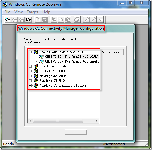 配置连接的对话框名称为'Windows CE Connectivity Manager Configuration”,安装的相应的SDK在可选平台列表中也有显示。