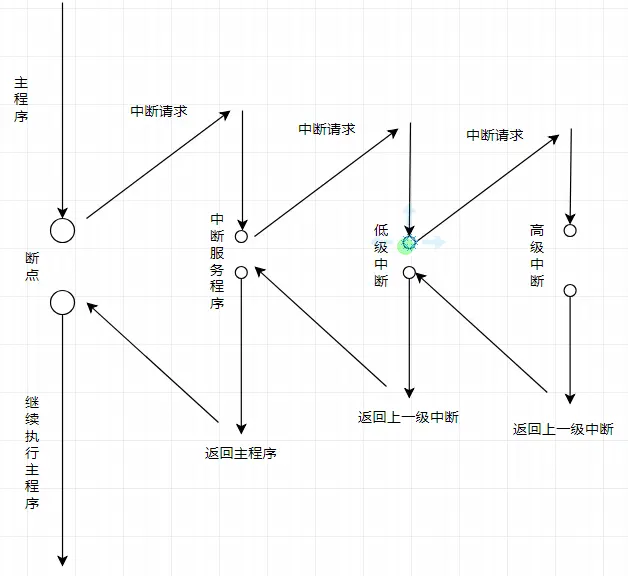 所谓中断就是指CPU正处于工作状态时,外部发生了某一事件(按键按下),请求CPU进行处理,于是 CPU暂时中断当前的工作,转而处理所发生的的事件,处理完毕在回到原来被中断的地方继续工作,这样的过程被称为中断