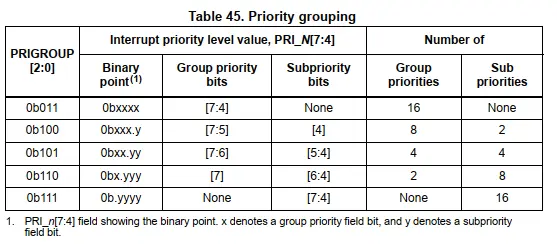 priority bits (__NVIC_PRIO_BITS), the smallest possible priority group is set.