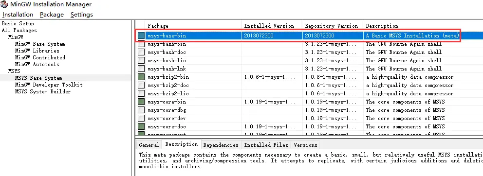 msys是MinGW的一部分,先下载MinGW安装器,安装完成后运行。选择MSYS,然后选择右边最上面的msys-base-bin,选中后会自动选中其他一系列的package,然后应用修改。