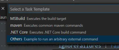 Ctrl+Shift+P,打开VSCode的命令行,输入configure task,选择Tasks:Configure Task -- 回车 -- Create task.json file form template -- 回车 -- Others -- 回车。
