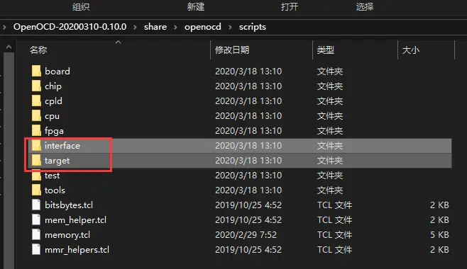 可以在openocd目录下的share->openocd->scripts下找到interface和target目录,里面有配置文件可以选择。