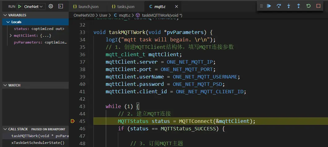 注意,需要先运行启动openocd的任务,然后切换到调试窗口,点击运行即可自动编译,然后烧写,然后运行到断点。