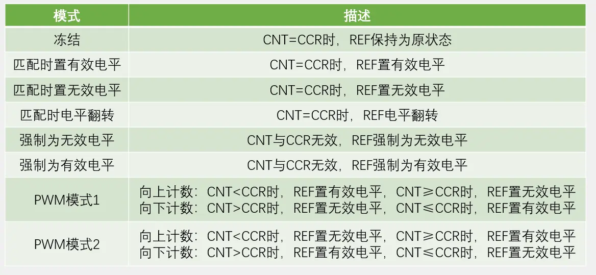 输出比较可以通过比较 CNT 与 CCR 寄存器值的关系,来对输出电平进行置1、置0或翻转等操作,用于输出一定频率和占空比的 PWM 波形;