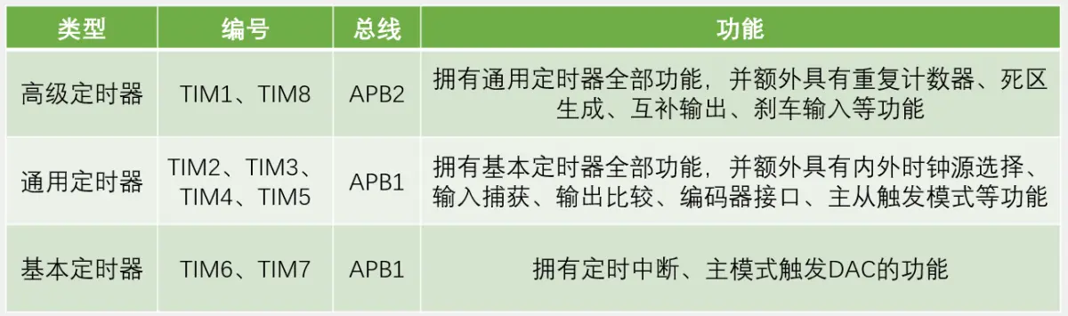 不仅具备基本的定时中断功能,而且还包含内外时钟源选择、输入捕获、输出比较、编码器接口、主从模式等多种功能