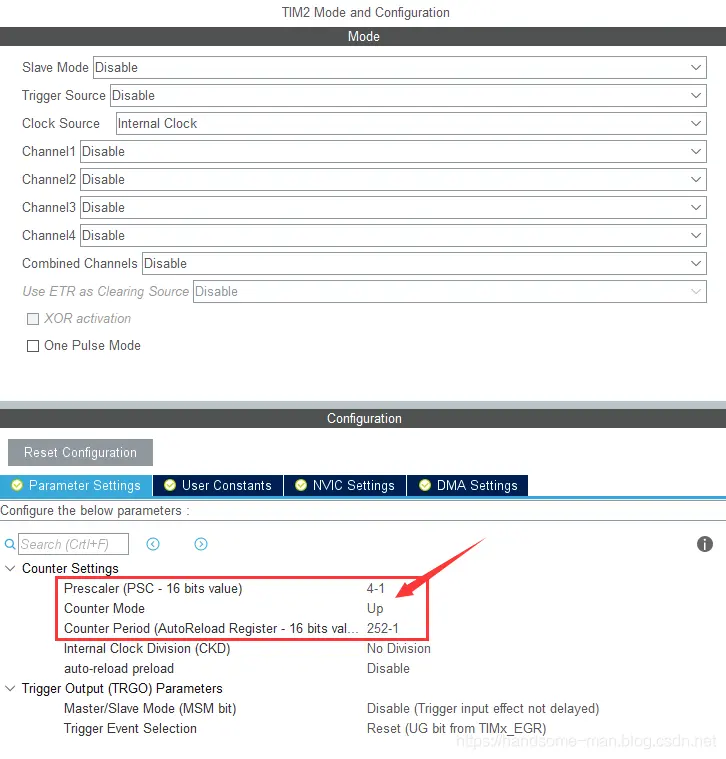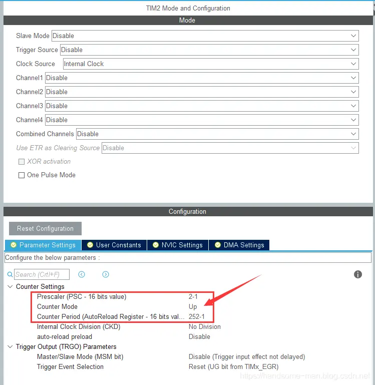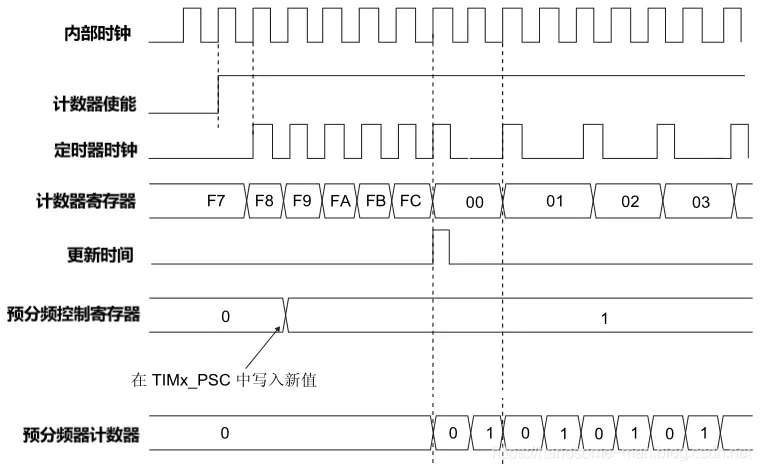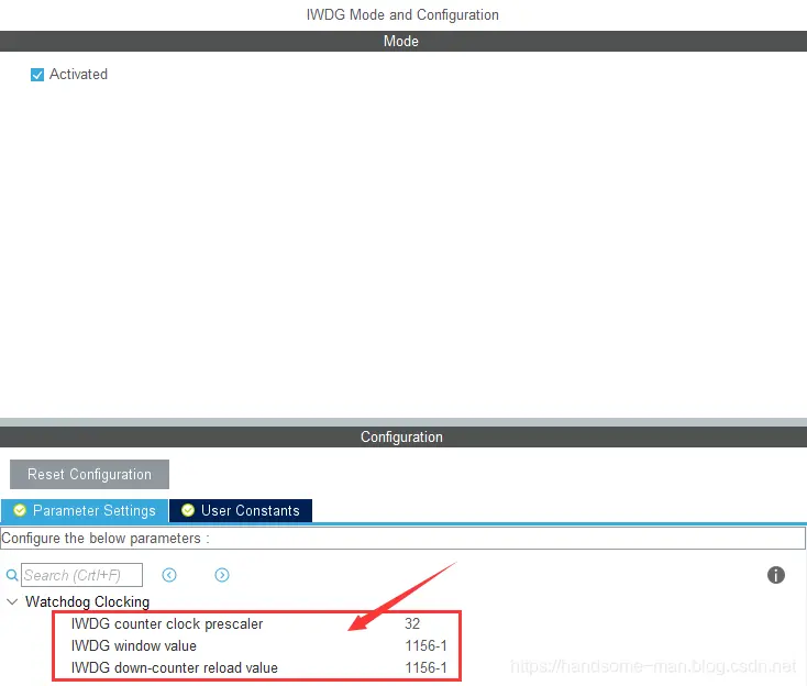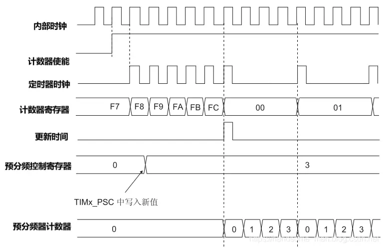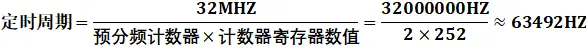 之前分享了STM32 GPIO的原理、特性、选型和配置、如何计算RTC时钟异步预分频和同步预分频,这次简要阐述STM32L011微控制器定时器的参数配置(其他型号大同小异,本文侧重讲解配置,至于各类定时器的特点后续再述),STM32定时器种类繁多有通用定时器、基本定时器、独立看门狗定时器、窗口看门狗定时器等。 STM32基本、通用类型可编程定时器主要由一个 16 位及其相关的自动重载寄存器组成,在配置基本、通用类型的定时器时有三种关键寄存器:计数器寄存器 、预分频器寄存器和自动重载寄存器,具体说明如下所示: 计数器寄存器:有递增计数、递减计数或同时递增和递减计数三类,计数器的时钟可通过预分频器进行分频; 预分频器寄存器:可对计数器时钟频率进行分频,分频系数介于 1 和 65536 之间(这里指STM32L011); 自动重载寄存器:当计数器达到上溢值(或者在递减计数时达到下溢值)时将发送更新事件,计数器寄存器将装载重新计数。 假设计数器寄存器数值为0xFC,采用2预分频,当使能计数器后,定时器时钟开始按照定时效果运行(定时由计数器寄存器和预分频器寄存器共同决定),计数器从0x00计数到0xFC后会产生中断,并更新时间开始新一轮的计数,从0x00计数到0xFC时间的长短由预分频控制寄存器决定,时序图如下所示: 数器寄存器数值为0xFC(十进制:252),采用2预分频的定时周期计算如下(假设使用32MHZ的时钟频率): 由于1HZ是1秒/次的频率,63492HZ就是,计数器从0x00计数到0xFC,定时周期为63492秒,使用STM32CuBeMX配置如下所示: 假设计数器寄存器数值为0xFC,采用4预分频, 时序图如下所示: 数器寄存器数值为0xFC(十进制:252),采用2预分频的定时周期计算如下(假设使用32MHZ的时钟频率): 计数器从0x00计数到0xFC,定时周期为31746秒,使用STM32CuBeMX配置如下所示: 独立看门狗定时器激活后,计数器开始从复位值 0xFFF (可通过窗口寄存器修改)递减计数,当计数器计数到终值 (0x000) 时会产生一个复位信号,在递减的过程中将键值 0x0000 AAAA 写到密钥寄存器中,计数器将会重载,从而避免产生看门狗复位,独立看门狗框图如下所示: 独立看门狗定时器有三种关键寄存器:窗口寄存器、预分频器寄存器和重载寄存器,具体说明如下所示: 窗口寄存器:默认值为 0x0000 0FFF(十进制:4095),当计数器值大于窗口寄存器中存储的值时,如果执行重载操作,则会产生复位; 预分频器寄存器:可对计数器时钟频率进行分频,分频系数最大为256(这里指STM32L011); 重载寄存器:当计数器计数到终值 (0x000) 时会产生一个复位信号,计数器寄存器将装载重新计数。 独立看门狗定时器时钟由LSI振荡器提供,STM32L011中LSI频率为37KHZ,看门狗定义周期时间的方式和基本、通用类型可编程定时器完全一致,假设定义1秒周期的看门狗定时器,超过1秒不喂狗就进行系统复位,计算方式如下所示: 当然由于LSI振荡器精度有限,在运行过程中会存在一定误差,使用STM32CuBeMX配置如下所示: 窗口看门狗定时器是可编程的自由运行递减计数器,窗口看门狗激活后当递减计数器值小于 0x40(从 0x40 递减到 0x3F) 时复位,在窗口阈值之外重载递减计数器时也会复位,只有在0x40~窗口阈值之间喂狗系统才可以正常运行,窗口定时器时序图如下所示: 时序图解析如下所示: T[6:0]:7 位计数器,用来存储看门狗计数器的值,它每隔PCLK 个周期递减一次,当它从 0x40 递减到 0x3F(T6 清零)时会产生复位; WDGTB[1:0] :定时器时基 ,有4种方式修改预分频器的时基:00:CK 计数器时钟 (PCLK div 4096) 分频器 1、01:CK 计数器时钟 (PCLK div 4096) 分频器 2、10:CK 计数器时钟 (PCLK div 4096) 分频器 4和11:CK 计数器时钟 (PCLK div 4096) 分频器 8; W[6:0]:7 位窗口值,用于与递减计数器进行比较的窗口值,超过窗口阈值系统会复位; 当递减计数器值从 0x40 递减到 0x3F时系统会复位; 0x40~W[6:0]之间可以刷新喂狗,确保系统正常运行。 窗口定时器超时值的计算公式如下: STM32L011中窗口看门狗定时器基于APB1频率,假设APB1 频率等于 32 MHZ,定义65毫秒周期的窗口看门狗定时器,计算方式如下所示: 使用STM32CuBeMX配置如下所示:1、基本、通用类型定时器